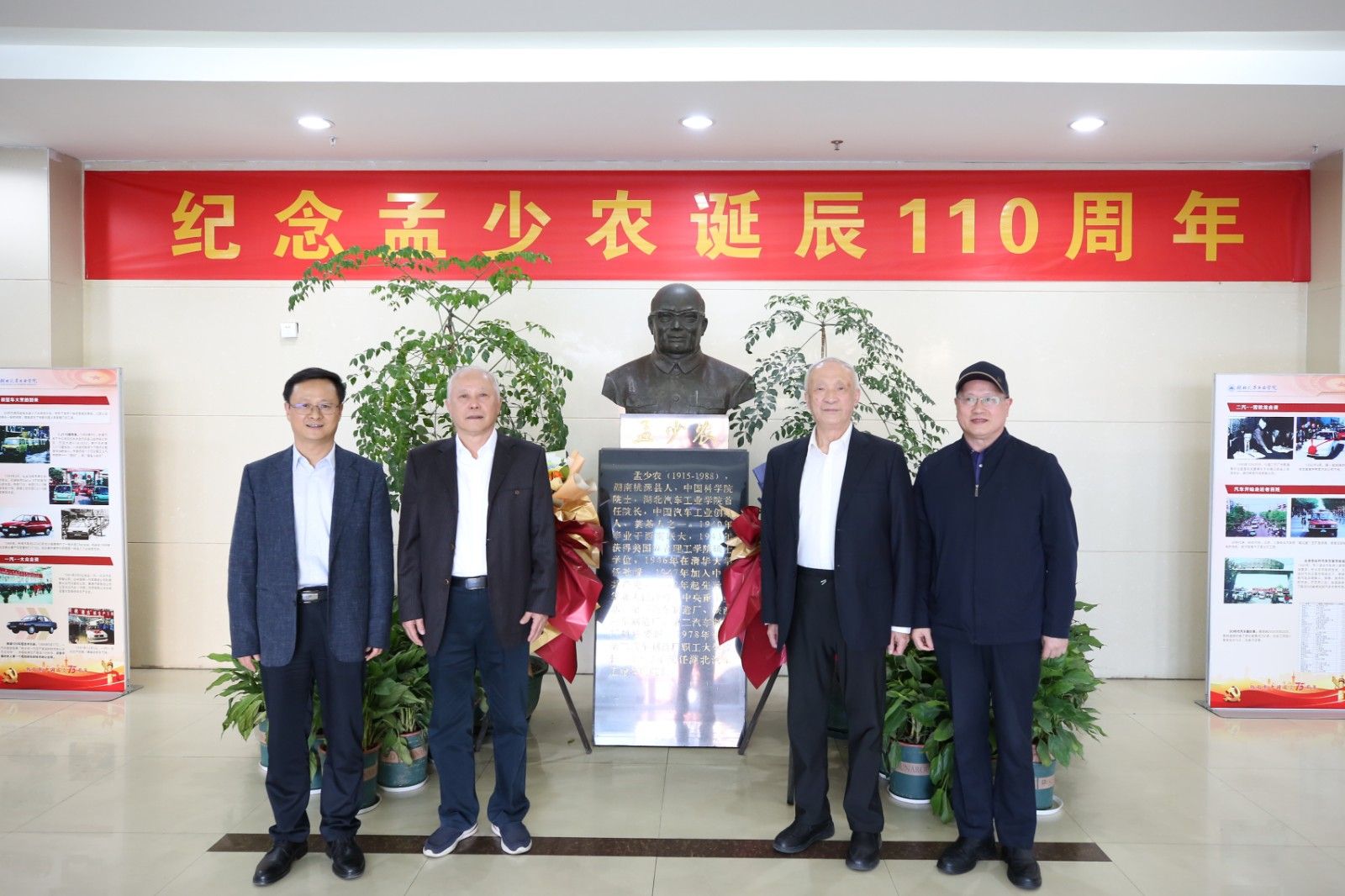 在孟少农铜像前,黄松和孟颀共同敬献鲜花并三鞠躬,深切缅怀中国汽车工业技术奠基人孟少农先生。在校史馆,凝视着泛黄的老照片,孟颀动容追忆:“1979年入校时仅一幢教学楼、三栋宿舍,如今新校区拔地而起,这是汽院人写给时代的答卷。”